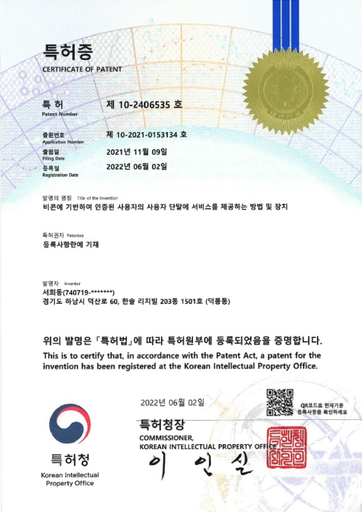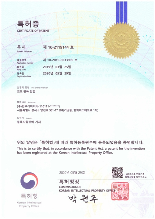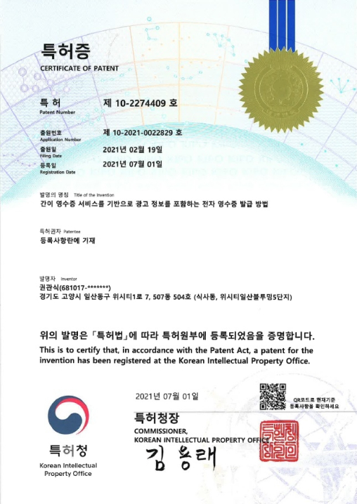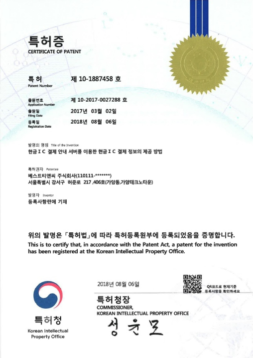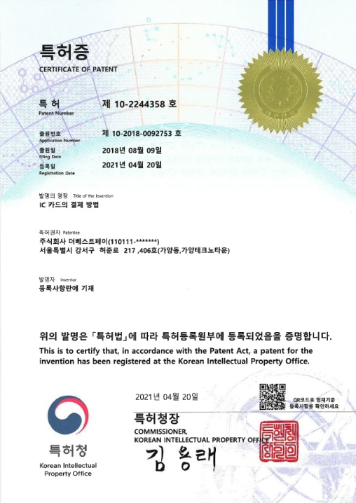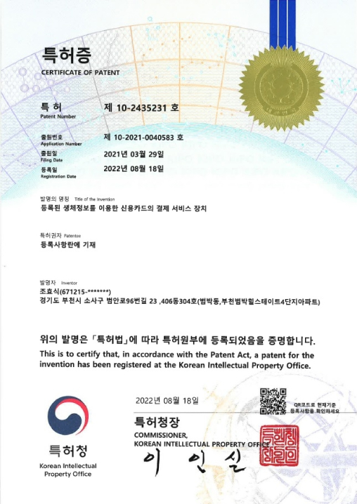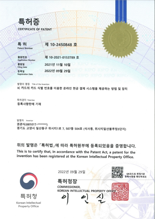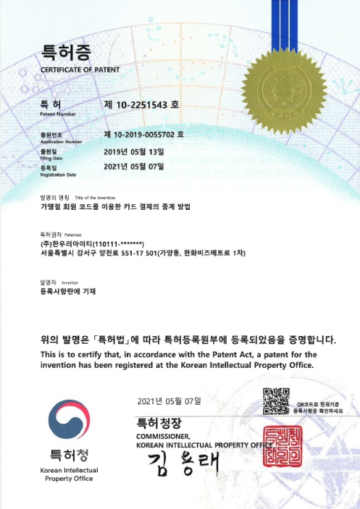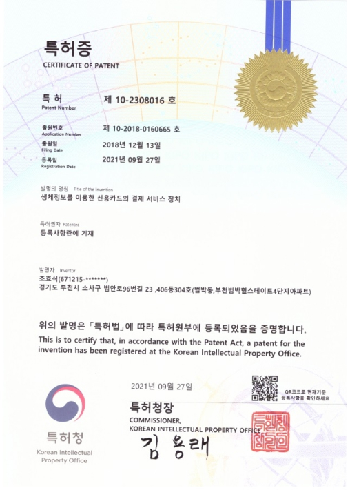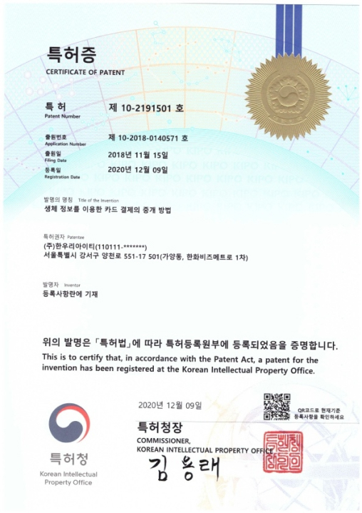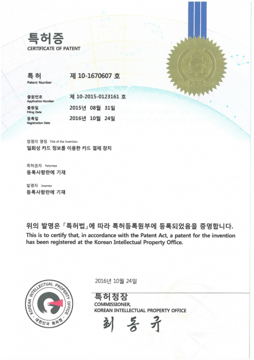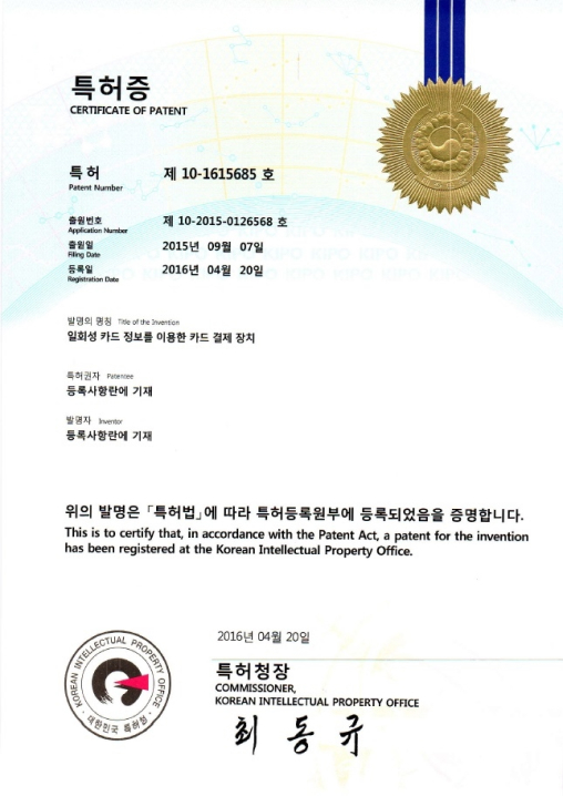 - 일회성 카드정보를 이용한 카드결제장치 특허 2건 취득