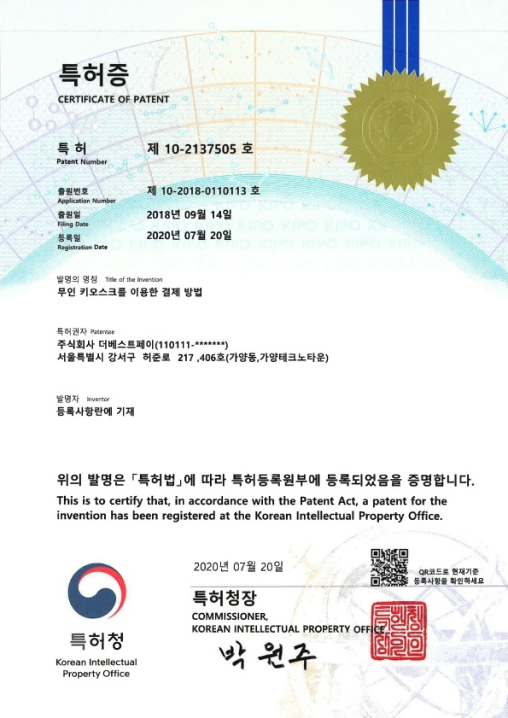 - 무인 키오스크를 이용한 결제 방법 특허등록