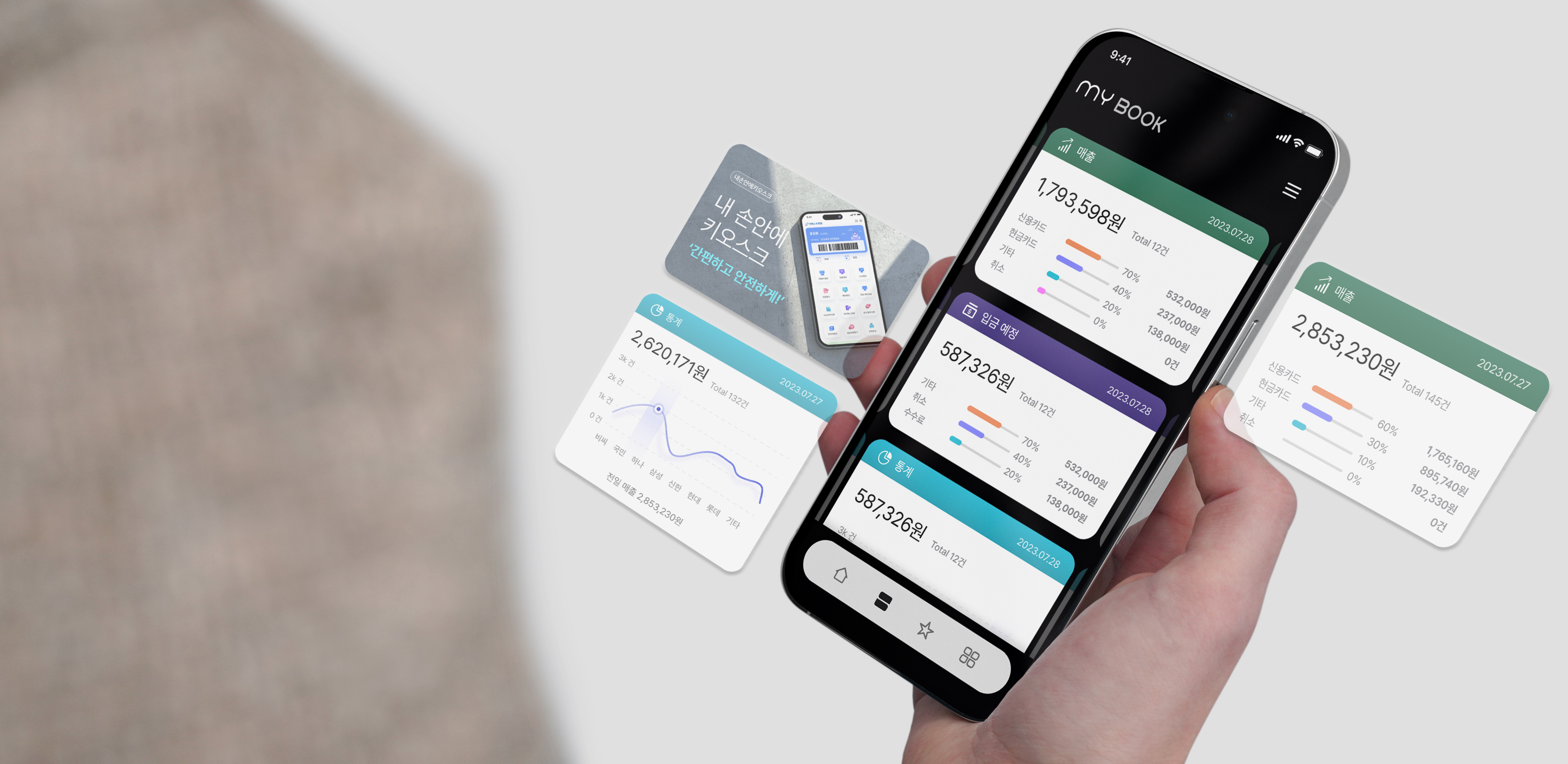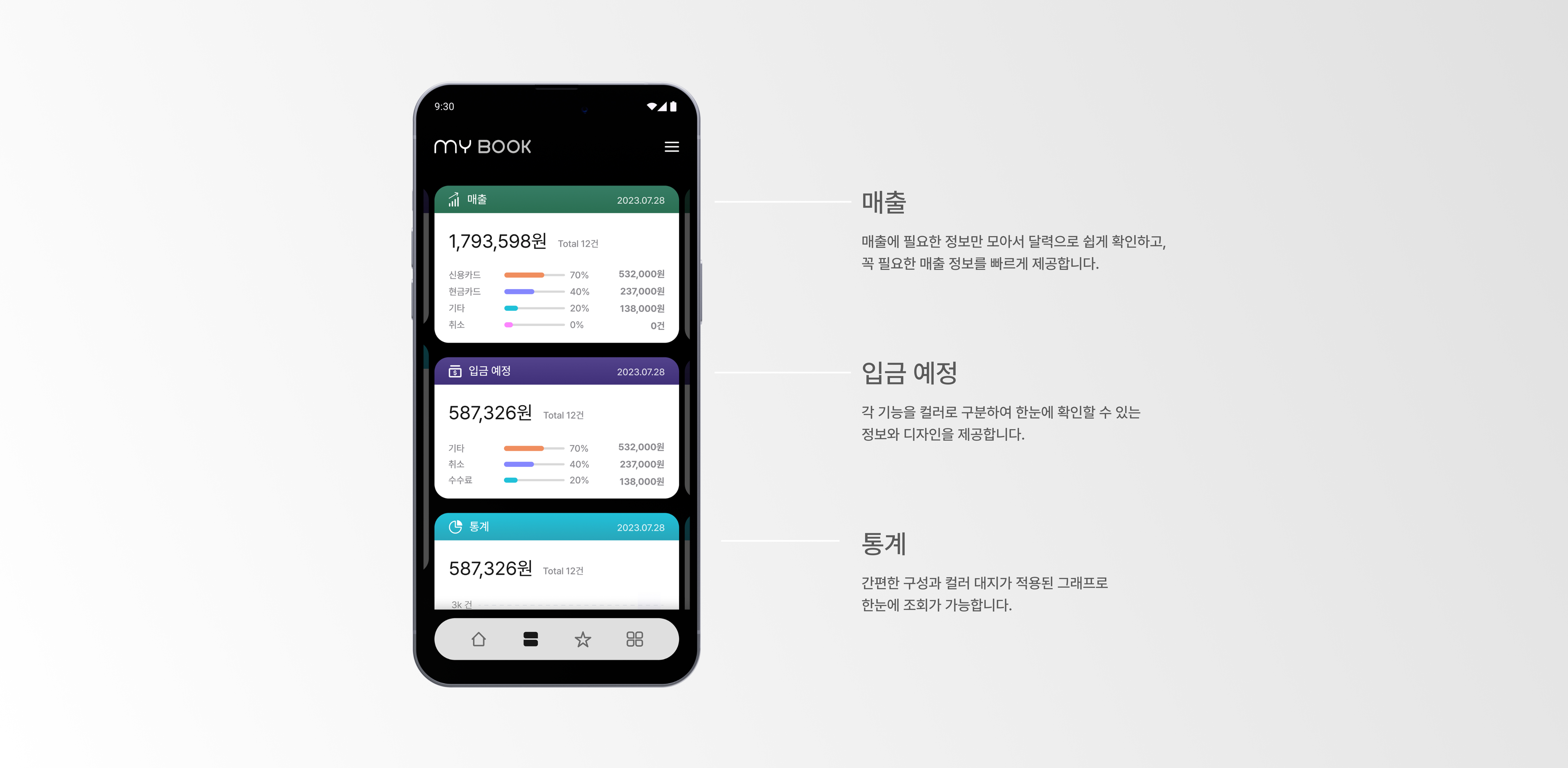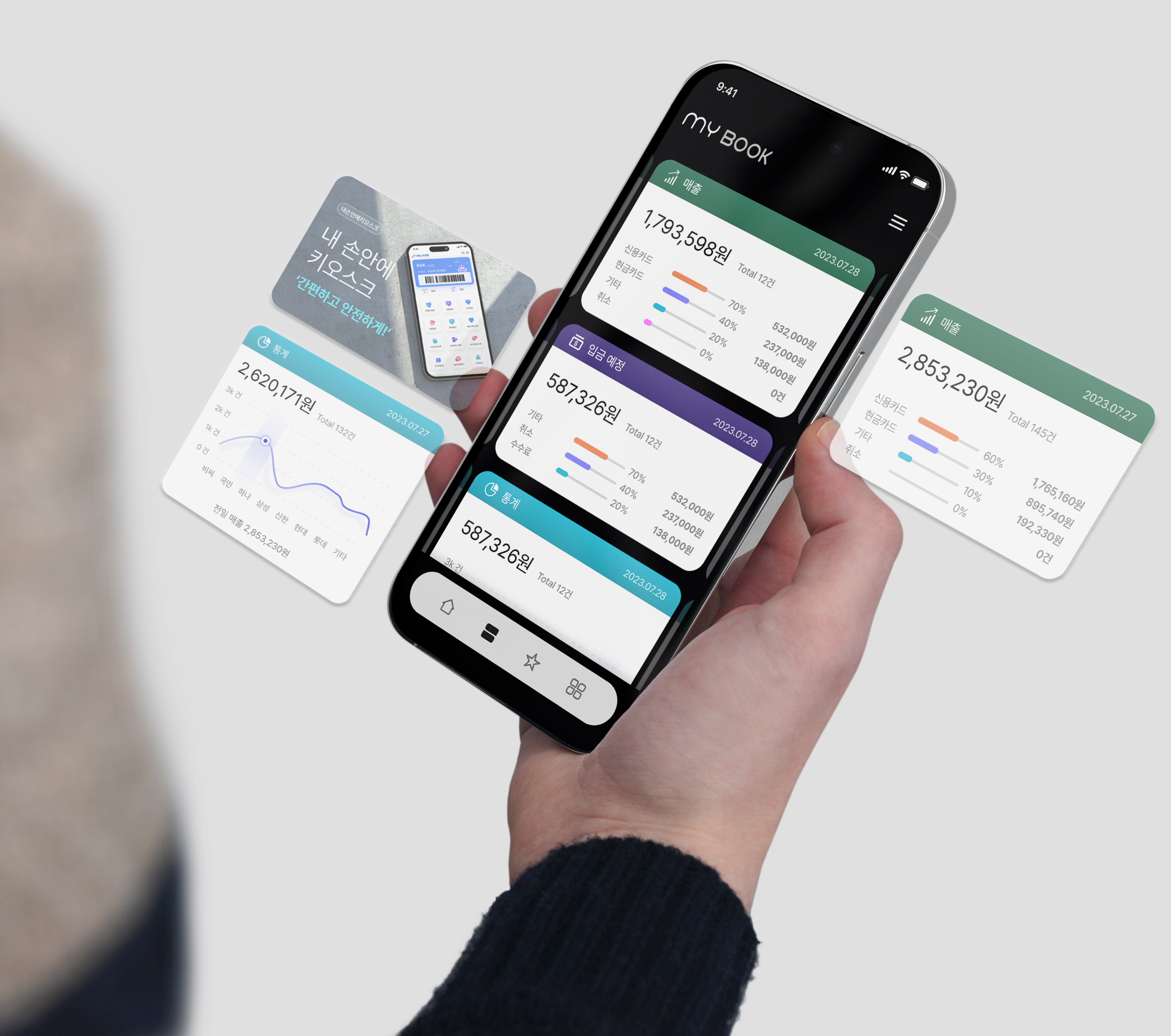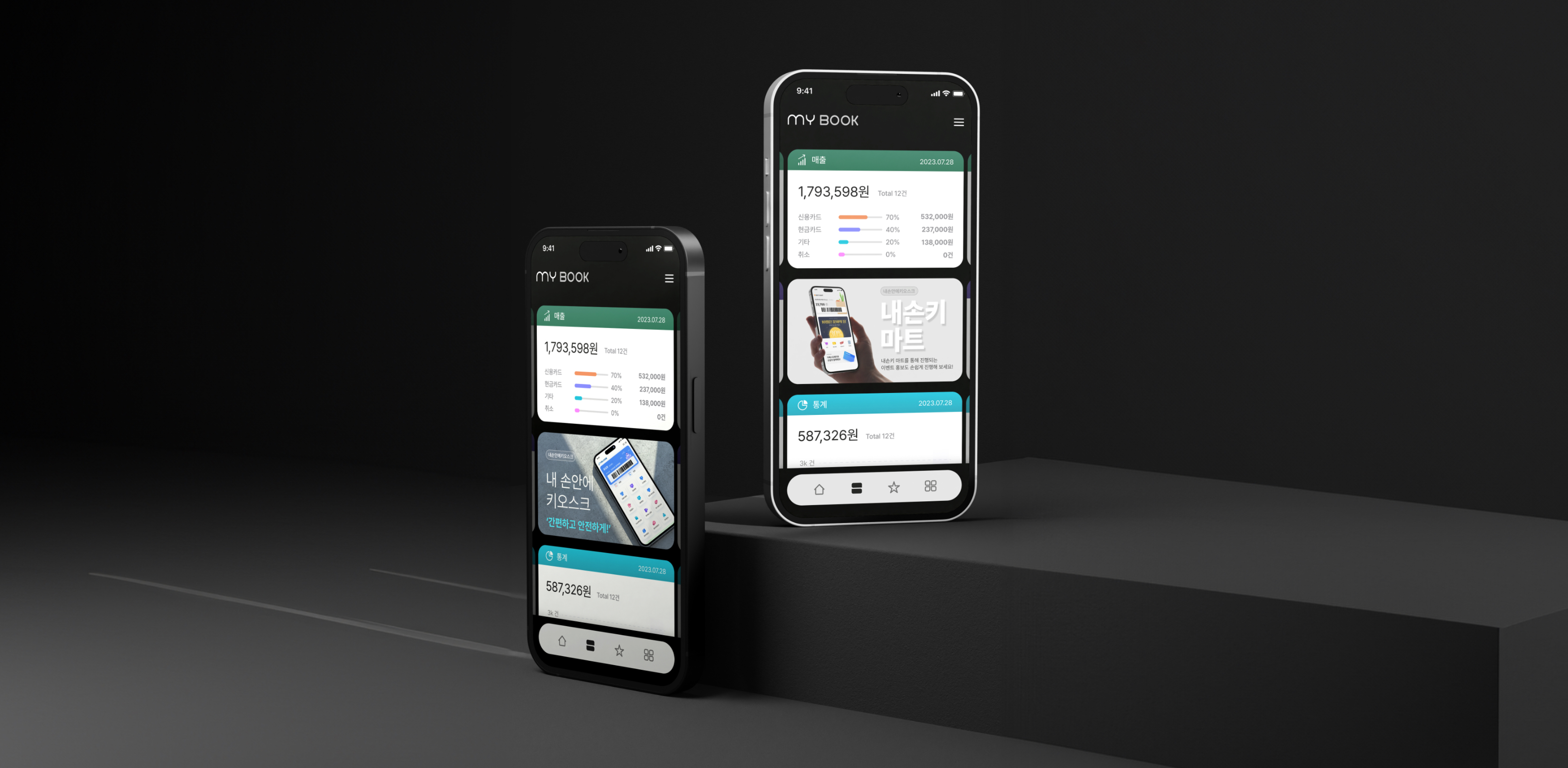 신뢰감을 주는 Blue Color를 적용하고 명도 구분으로 영수증이 MY BOOK의 M을 형상화하여 적용하였습니다. MY BOOK은 사용자에게 신뢰감을 주고 또 하나의 직원처럼 매출, 입금(반송), 통계 자료를 제공하여 꼭 필요한 정보를 쉽고, 빠르게 제공합니다.