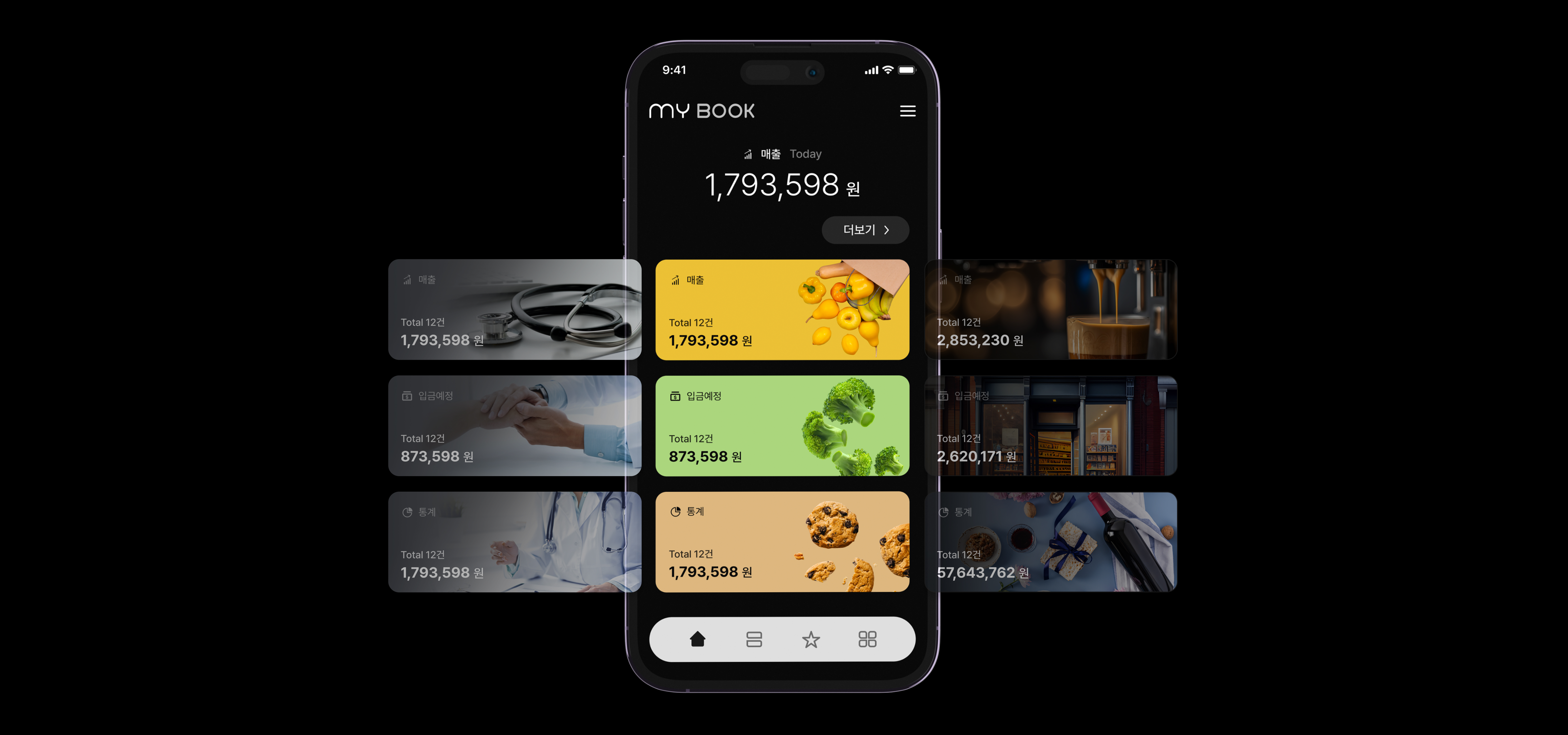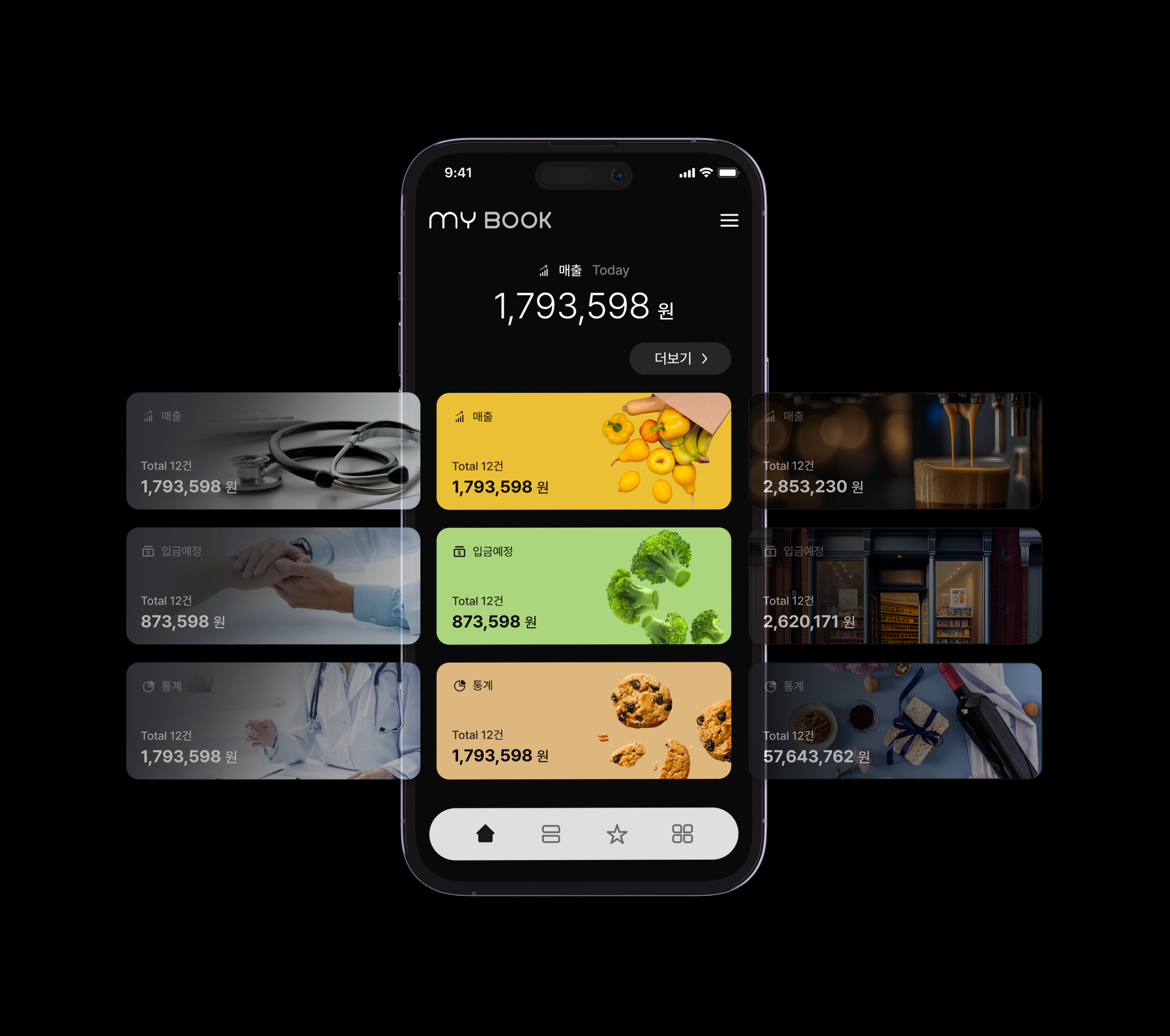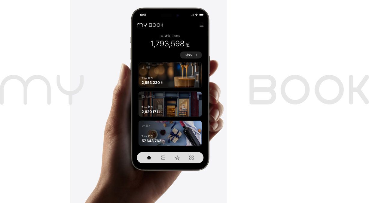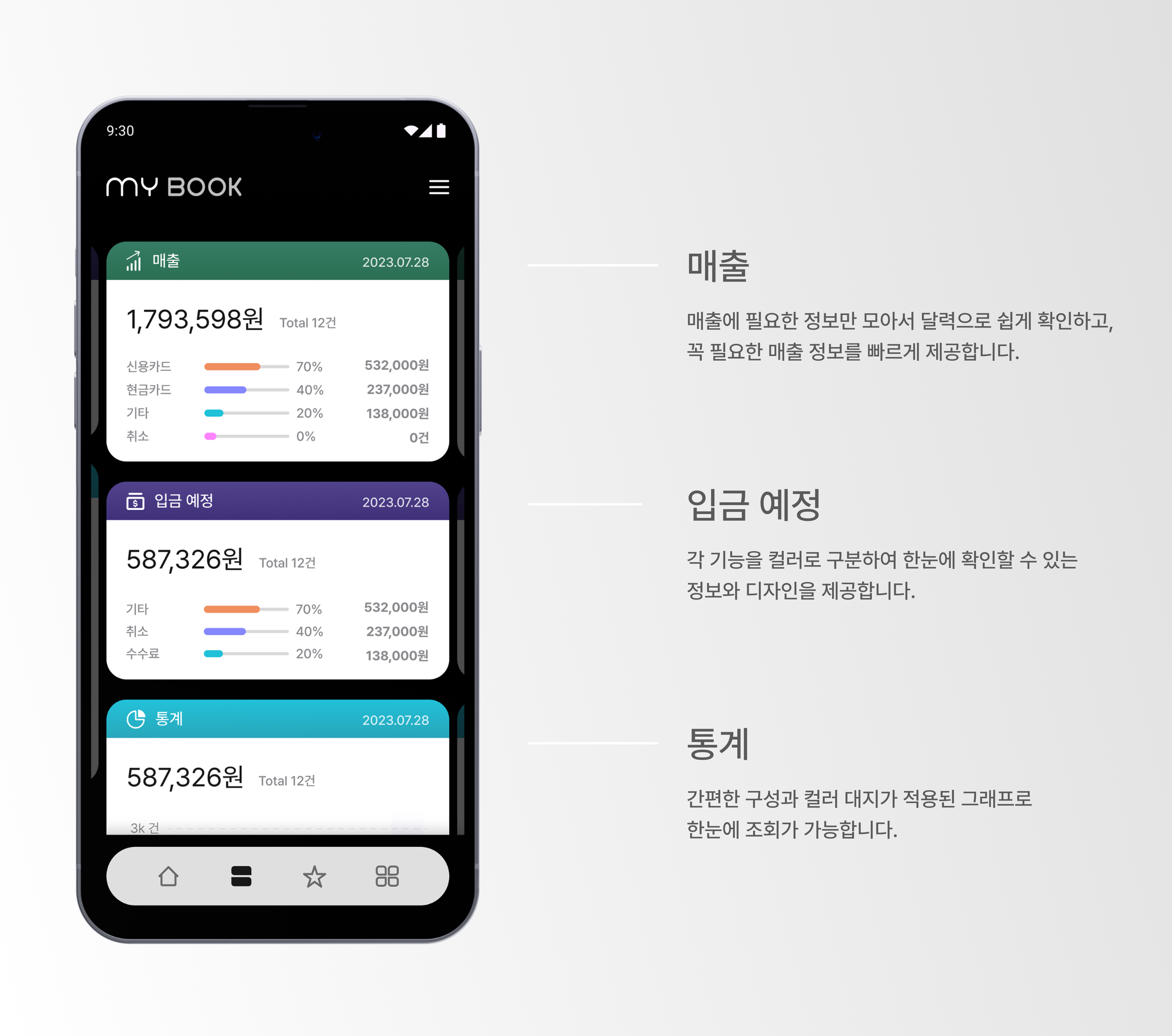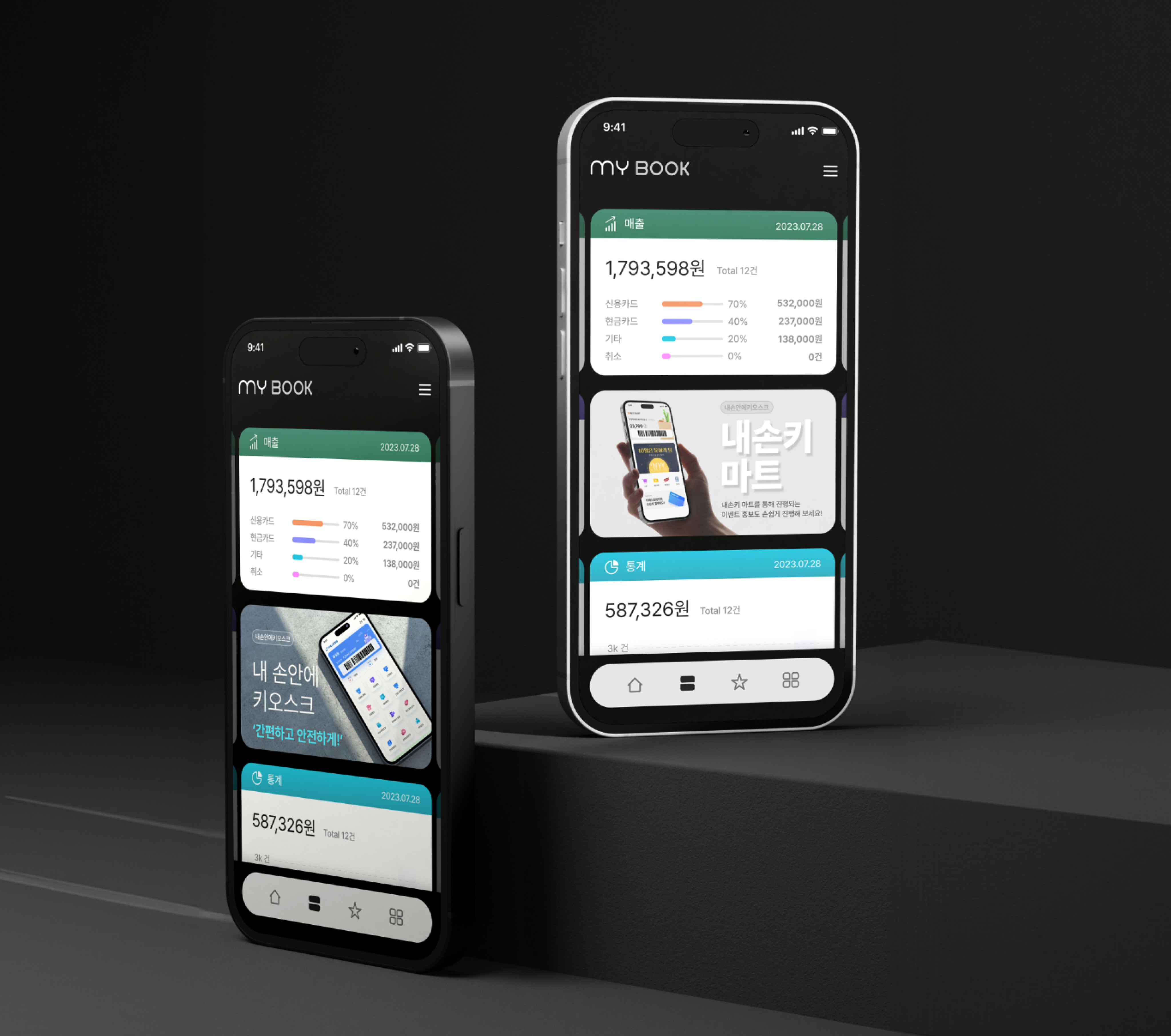 신뢰감을 주는 Blue Color를 적용하고 명도 구분으로 영수증이 MY BOOK의 M을 형상화하여 적용하였습니다. MY BOOK은 사용자에게 신뢰감을 주고 또 하나의 직원처럼 매출, 입금(반송), 통계 자료를 제공하여 꼭 필요한 정보를 쉽고, 빠르게 제공합니다.