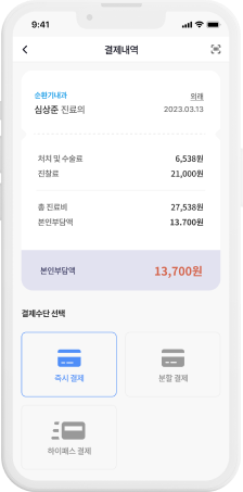 환자가 병원 내 수납 창구를 방문하거나 대기하는 일 없이 모바일로 간편하게 결제할 수 있는 서비스입니다.