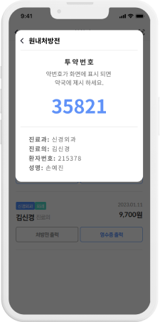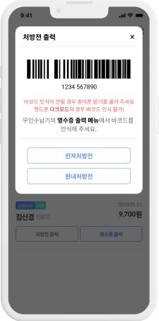 진료 후 접근성이 뛰어난 카카오 알림톡, QR코드/NFC 태그 배너, 태블릿을 통해 고객이 직접 스마트폰으로 진료비 수납 및 처방전 QR을 발급받습니다. 진료비
