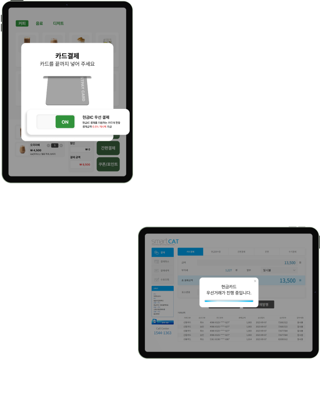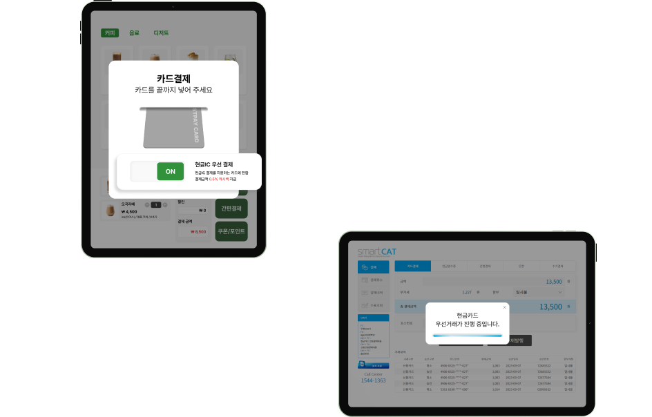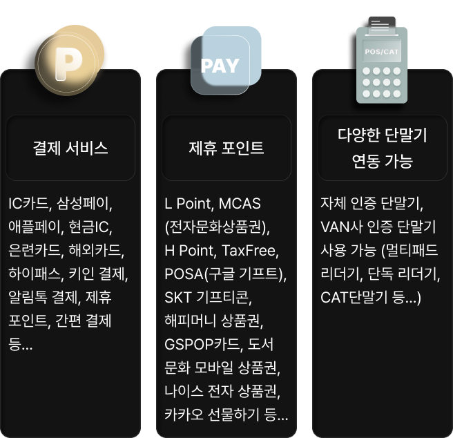 IC 카드에서 [현금카드], [신용카드] 정보를 동시에 획득하는 필터링 특허 기술과 자체 개발한 결제 프로세스를 통해 현금 IC 결제 비율을 향상시켜 가맹점에겐 수수료 인하, 고객에겐 캐쉬백의 혜택을 제공합니다.