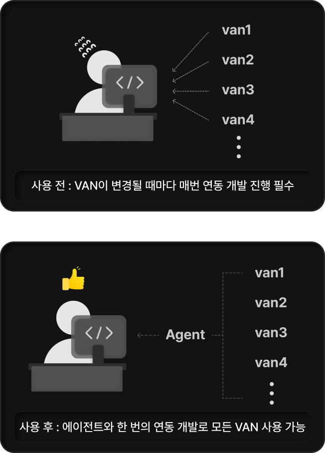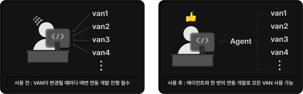 범용 에이전트는 VAN사의 결제 전문을 통합하여, 한 번의 연동 개발로 모든 VAN의 결제 서비스를 이용할 수 있습니다.