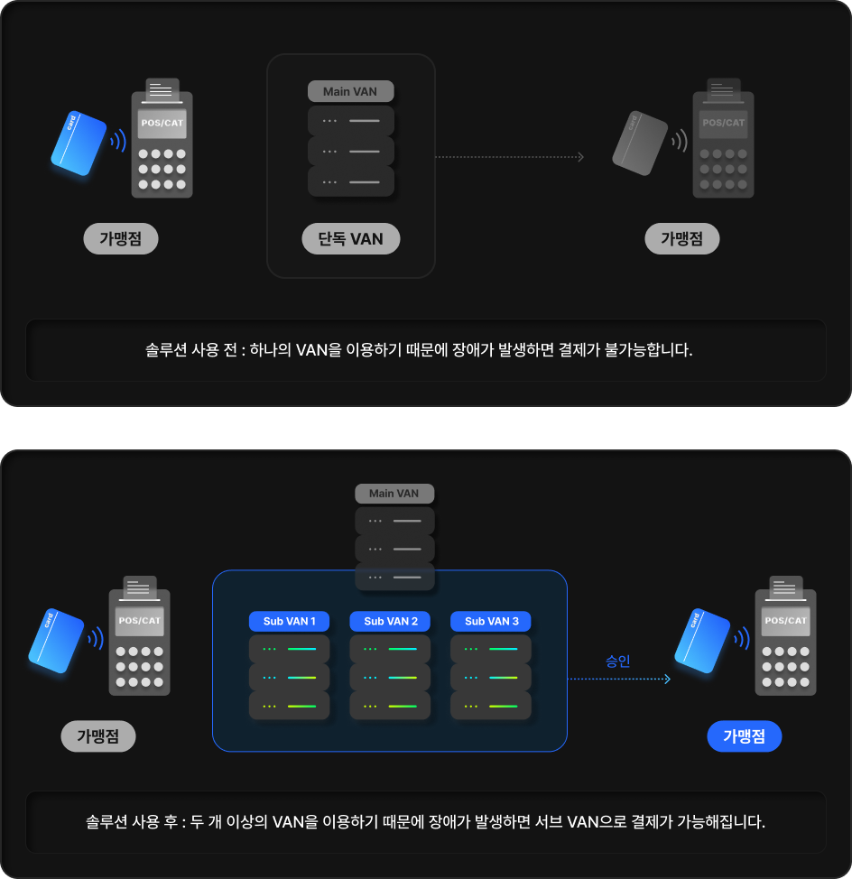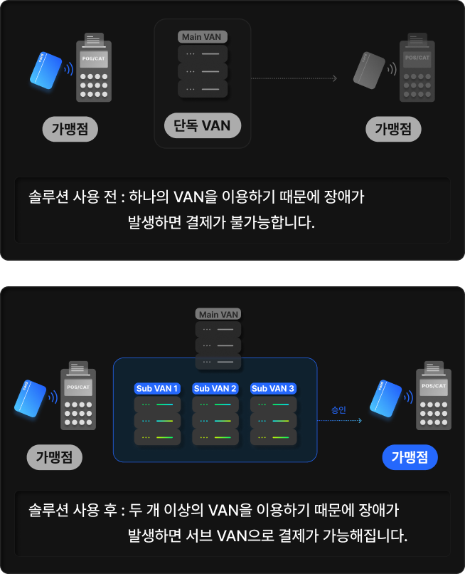 VAN 또는 카드사의 통신, 전산 장애 등 만일의 사태를 대비하여 즉시 대처 가능한 멀티 VAN 환경을 구축하였습니다.