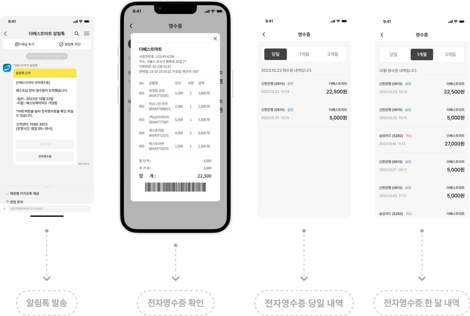 간편 영수증 조차도 결국엔 낭비되는 자원입니다. 대형마트에서나 사용하던 전자영수증을 이제 여러분들도 도입할 수 있습니다.영수증 발급 및 행사 알림 등에 사용되는 자원과 비용을 제로로 만들어 드립니다.