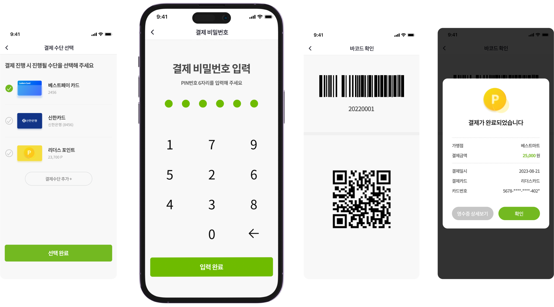 - 앱카드(8개 카드사), SSG PAY, Lpay, 카카오페이, 하나맴버스, T-Pay, 스마일페이, 알리페이, 위챗페이, 네이버페이, 라인페이, 페이코, 유니온페이, 제로페이